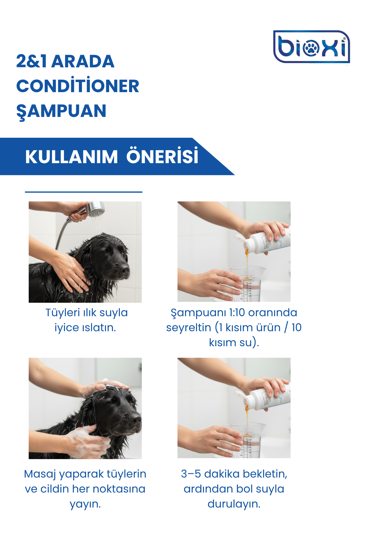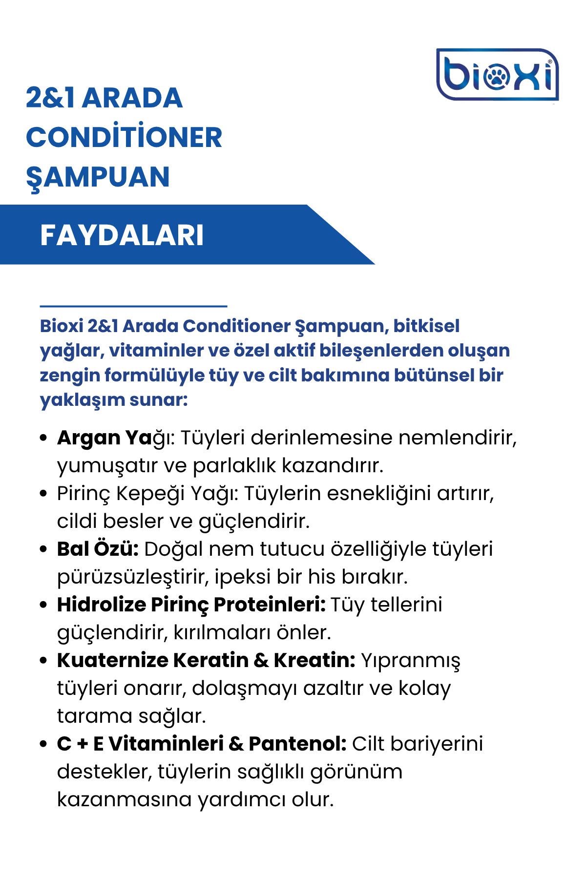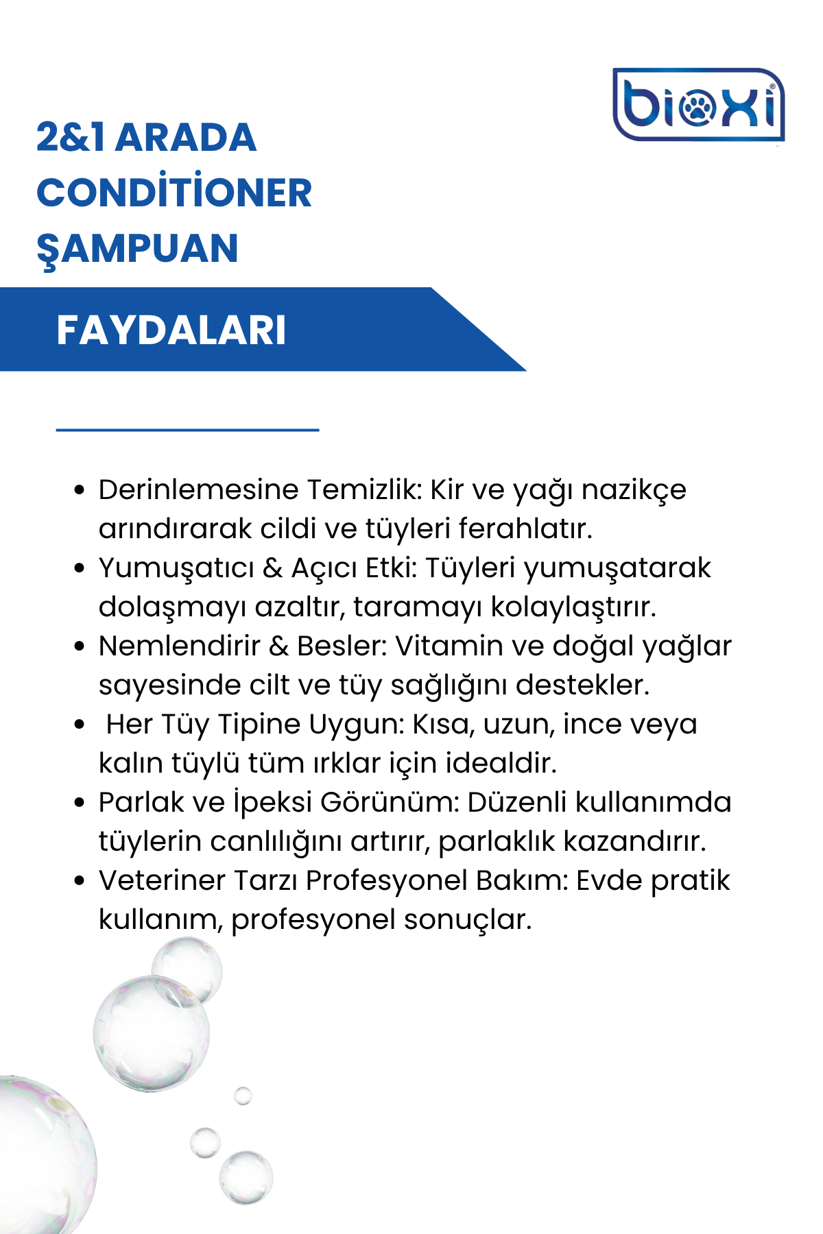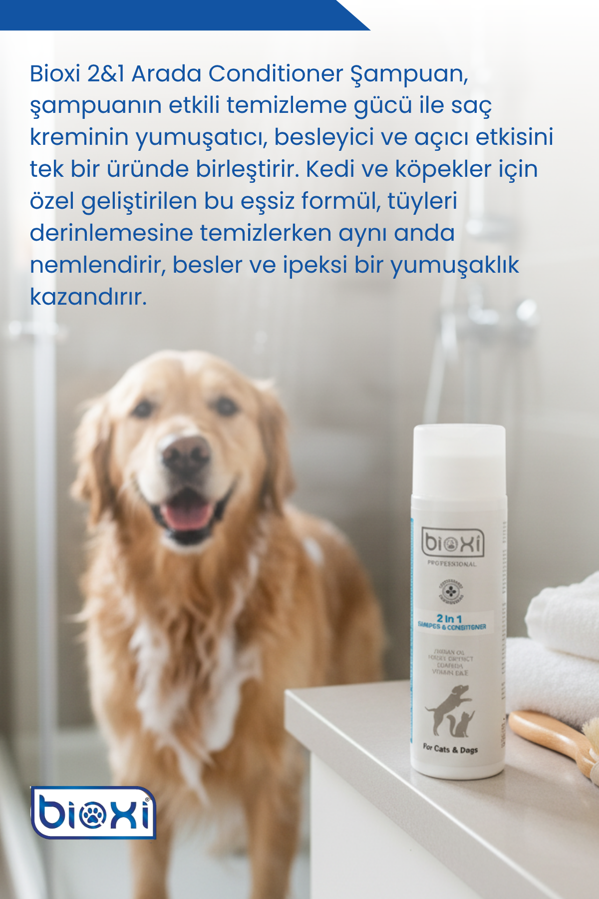 Evcil dostunuzun tüy bakımını kolay, etkili ve keyifli hale getirin! Bioxi® 2 in 1 Bakım Kremi ve Şampuan, şampuanın derinlemesine temizleme gücünü, bakım kremi etkisiyle birleştirir. Tek adımda hem temizlik hem de ipeksi yumuşaklık sağlar. Kedi ve köpeklerin tüm tüy tipleri için uygundur.