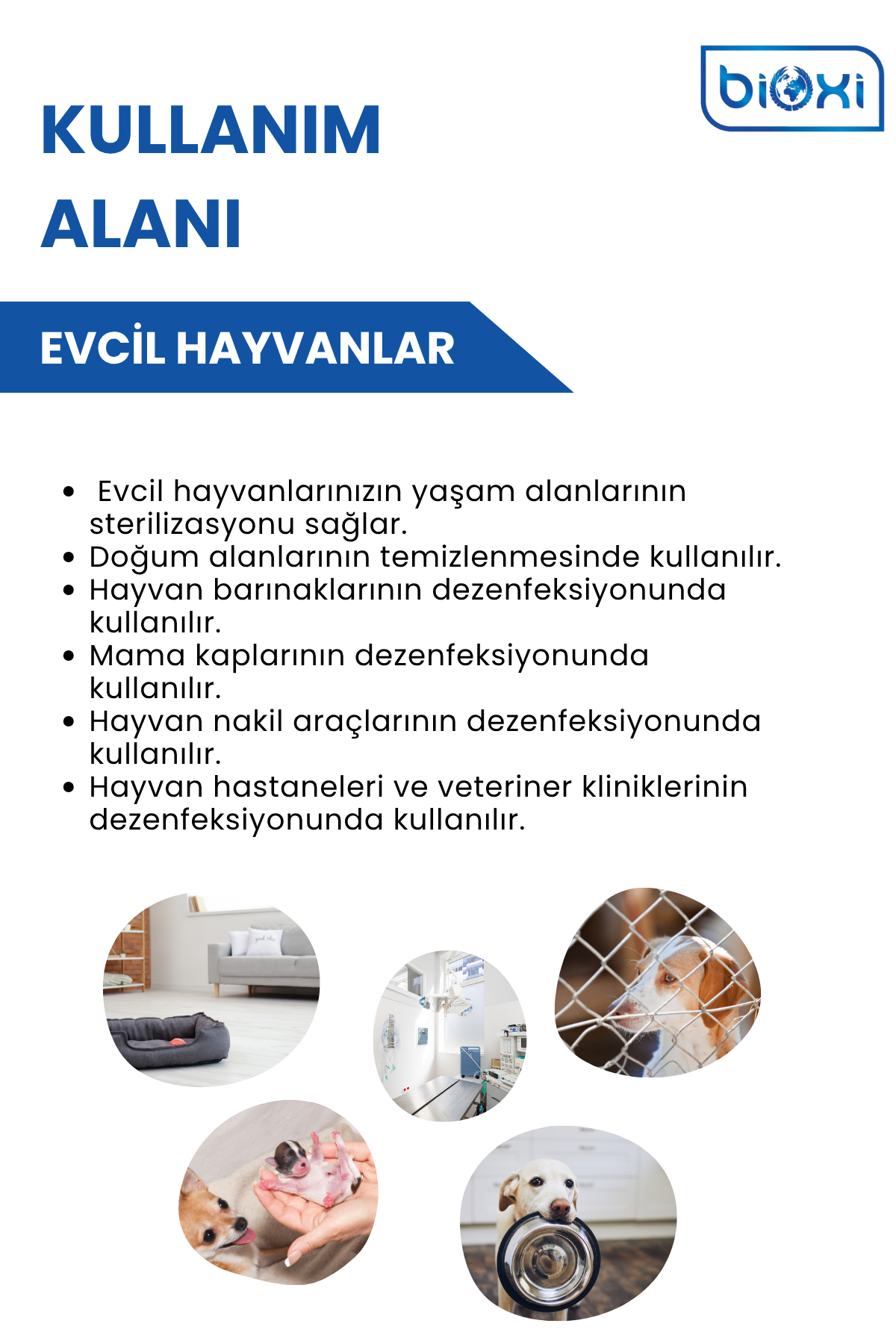 Bioxi® Veteriner ve Hayvan Dezenfektanı, evcil hayvanlar, büyükbaş hayvanlar ve kümes hayvanları için güvenli ve etkili bir hijyen çözümüdür. Günlük kullanımda sağlıklı yaşam alanları oluşturmak için ideal tercih.